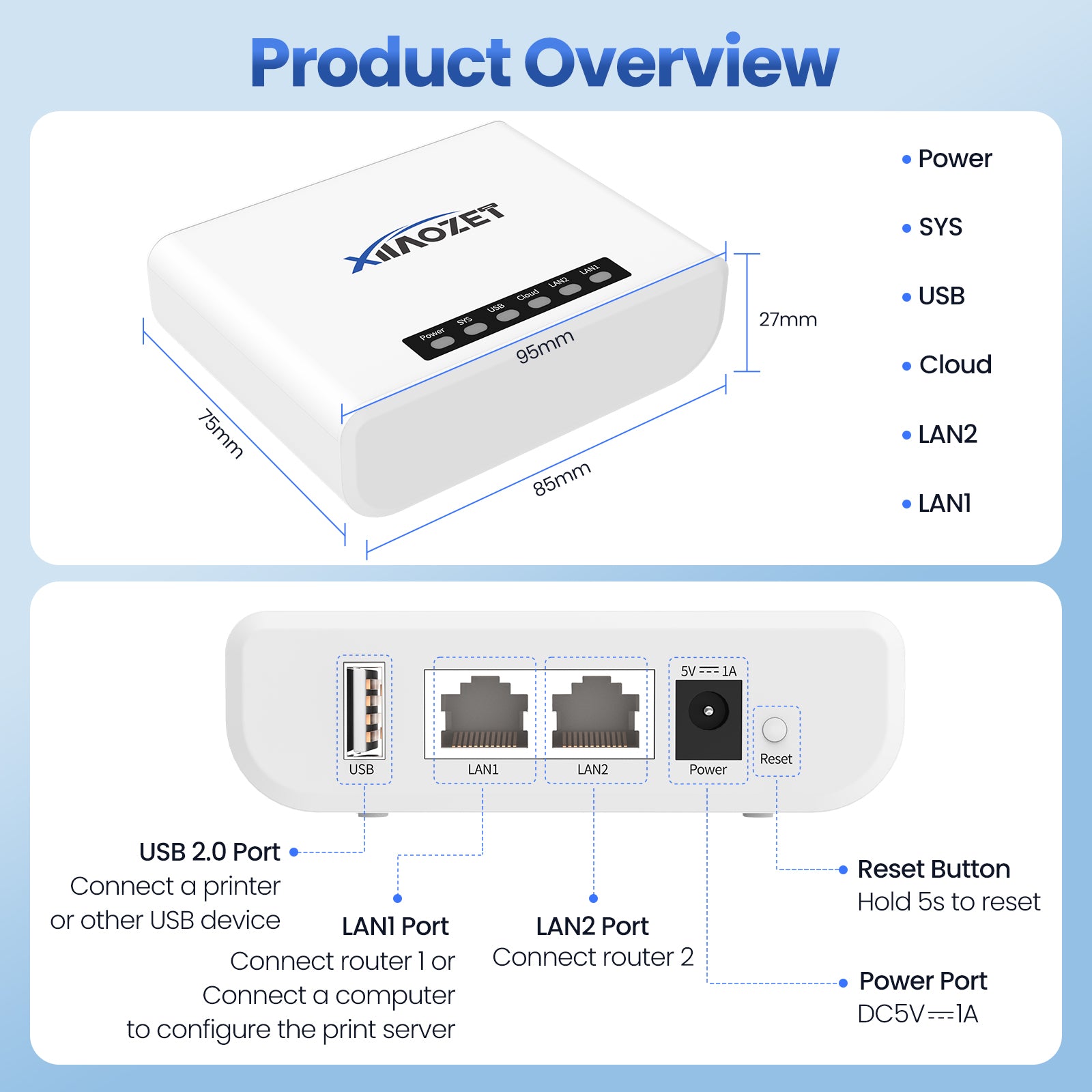 This product combines the functions of both a USB server and a print server, allowing up to three USB devices (such as printers, scanners, or USB storage) to be shared among multiple PCs on the same network. This eliminates the need for direct physical connections between PCs and devices, simplifying cabling.