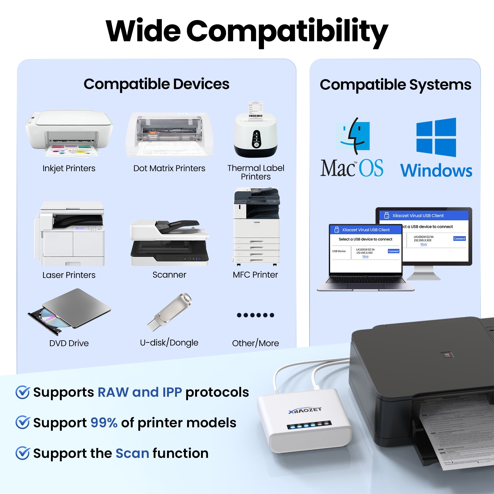 Supports standard TCP/IP printing (Raw mode / IPP). For compatible printers, you can print directly using Windows’ built-in printing feature by specifying an IP address or hostname. For printers not supporting these protocols, our dedicated Virtual USB software enables wireless printing.